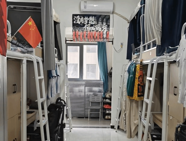 参观过程中所见皆是严谨有序的“方寸乾坤”,这既是学生自律习惯的写照,更是年级在学生管理水平的外化体现。内务方面,被褥叠放整齐划一,物品收纳科学规范,地面洁净窗明几净,细微之处尽显同学们在日常管理中“抓细、抓实、抓常”的扎实功底。更为亮眼的是创新性地将体育特色融入到宿舍文化建设中,实现了“专业素养”与“生活养成”的完美契合。这种“专业+思政”的浸润式管理模式,不仅增强了学生的集体凝聚力与归属感,更生动诠释了以文化人、以文育人的创新思维与引导能力。
