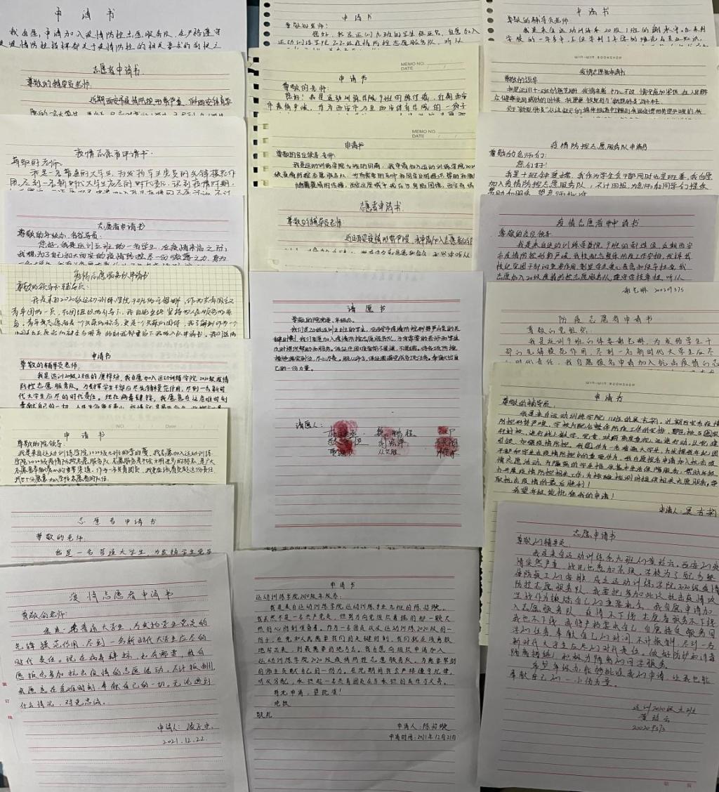 数九寒冬暖人心。疫情发生后,学院领导特别关注和关心被隔离的教师,我院教师吴洁老师被隔离后,党委书记王鑫每天与吴老师通话,主动关心问候,及时心里开导;党委组织员宋文杰老师时刻挂念在鄠邑校区值守的教师,在解除隔离后,想办法自费为鄠邑校区老师购买相关物资;同时学院为有困难的教师随时做好服务。运动训练学院学生主动请缨,自愿申请加入疫情服务志愿队,他们有的在核酸检测现场维持秩序,有的在为隔离学生送水送餐。与此同时,一封封志愿申请书也源源不断的递交到年级办公室,它们像一阵阵暖流,融化着疫情寒冬下的冰雪。截止目前,年级办已收到160多份申请书,这个数字还在不断增加。年级办就志愿者报名人数立即成立了三个志愿小分队,随时待命,为校区和学生提供服务。