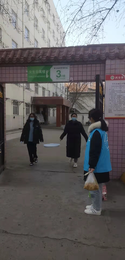 运训学子们不畏严寒,不辞辛苦,在食堂、宿舍、引导同学测量体温、进行登记,有序进出,引导购餐学生按要求排队等候,疏散聚集人员,确保食堂就餐有序安全。配合学院做好晨晚检、健康打卡、测量体温、消杀等工作。