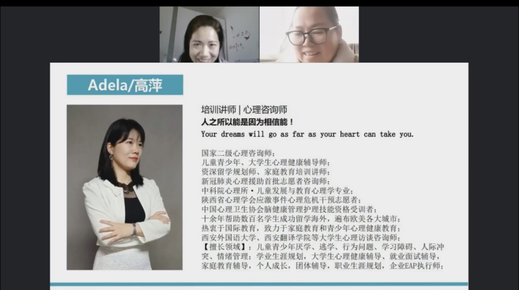 讲座中高萍结合当前面临的疫情防控形势,针对学院在校学生的具体实际,通过对目前封闭期容易产生的一些负面情绪、对如何缓解负面情绪、大学学业分析及相关心理成因进行系统分析,从封闭期间学习心理建设、情绪管理、危机干预等方面,与学生进行了深入在线交流解答,帮助学生调整心态,引导学生合理规划封闭期学习生活和大学学业,望珍惜当下,充实快乐地度过封闭期间的学习生活和大学生活。
