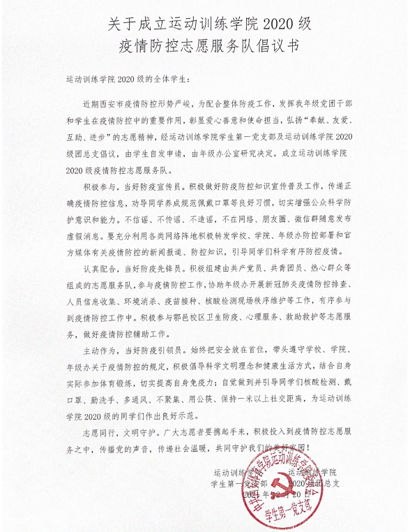 面对愈发严峻的疫情形势,西安市实施疫情防控提级管理,全面加强管控措施。为积极响应学校疫情防控工作部署,深刻贯彻落实学校有关文件精神,运动训练学院2020级师生团结一心,共同抗疫,迅速组建抗疫志愿服务队,筑起抗疫坚强堡垒。倡议书一经发出,同学们踊跃报名,奋勇争先,那一封封请战书带着青春热血,响应号召,勇于担当,积极行动,奉献青春力量,他们说战“疫”我们不能缺席,志愿加入防疫工作第一线。小小的纸张承载着铮铮的铁血誓言,朴实而有力的战书,体现着坚守与担当。疫情就是命令,他们用行动回应着“请党放心,强国有我”的祖国号召。截止目前已有160余名同学加入到这支抗疫队伍中。他们在本次疫情防控中冲锋在前,激扬青春,点亮战“疫”光芒,守护平安校园。