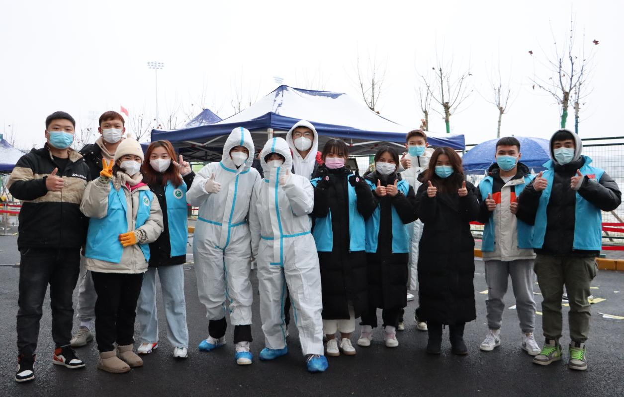 从左至右:黄环(辅导员)、张巍、吴桐欣、邹晓慧、马雪芳(防护服)、马蜻莲(防护服)、杨博、宗星星、卢沁韦、周泓伯、雷璇(辅导员)、倪川、张孙豪