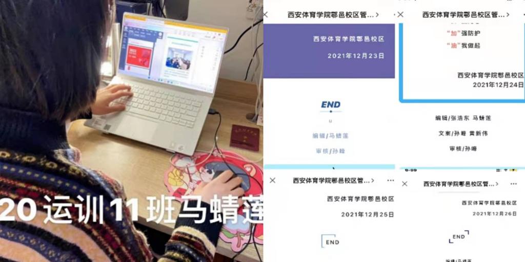 为配合校区防疫宣传,增强同学们的疫情防控意识,运动训练学院2020级11班马蜻莲同学从12月24日起,一直负责校区防疫宣传工作:为每日执勤的志愿者摄影,负责鄠邑校区每日疫情动态汇总及推送;陪同学校党委副书记高玉峰、副校长张卫国巡视校区基本情况及各二级学院和各职能部门的工作;参与校领导及校区管委会组织的疫情防控会议,严格执行会议精神,精准下达会议指令。