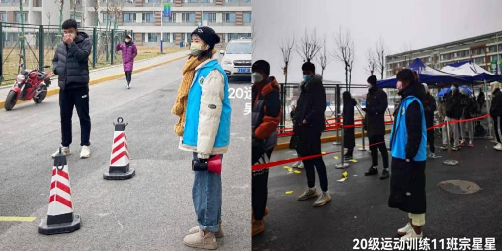 在严寒冬日里,志愿者们引导一批又一批同学们有序进行检测,保证了核酸检测工作的高效,为医护人员争取了时间,为学校树立高效有序抗疫的面貌贡献了力量。