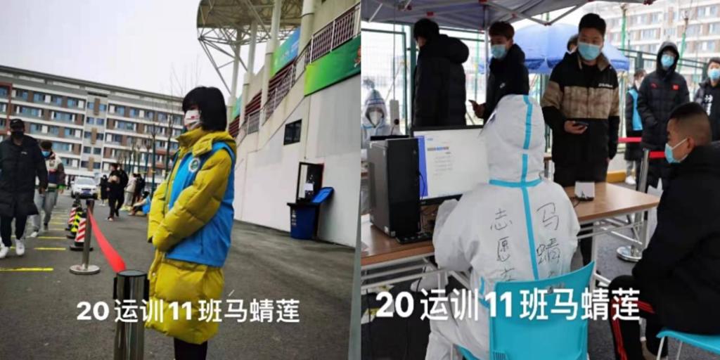 来自运训2020级11班的马蜻莲同学,自12月18日起每一次全员核酸都坚守在志愿服务岗位上,组织校区志愿者协助医护人员进行扫码、维护现场秩序以及完成每次核酸检测收尾工作。