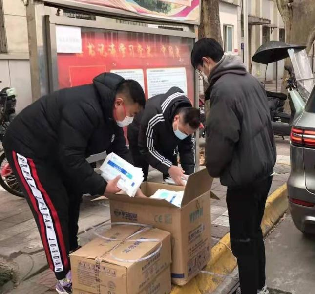 照片十四:年级主任张即帅、兼职辅导员南海涛给学生搬运发放校友捐赠防疫物资,带领党员先锋队维持核酸检测秩序