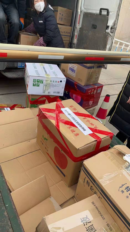 在做好学生工作的同时,王慧颖老师积极向各位焦急等待的家长通报西安的疫情发展情况,以及学校的应对措施、同学们的隔离现状等等,家长们均对学校的相关安排表示理解和赞同。但由于目前疫情隔离防控政策影响,部分物资仍处于短缺的状态,王慧颖老师发动家长们群策群力,在力所能及的范围内帮助学校解决同学们的现实需求。2021年12月28日下午,19级实验班各位家长纷纷捐款,委托马婉婷同学的家长联系了防疫物资和水果,并且在符合学校防疫规定的前提下,将物资运送到学校门口,部分学生志愿者在辅导员王慧颖老师、陈德鹏老师的带领下,对物资进行了签收、整理、归纳,并分发到各位同学的手里,同时还将部分物资带到了坚守在第一线的院领导手里。