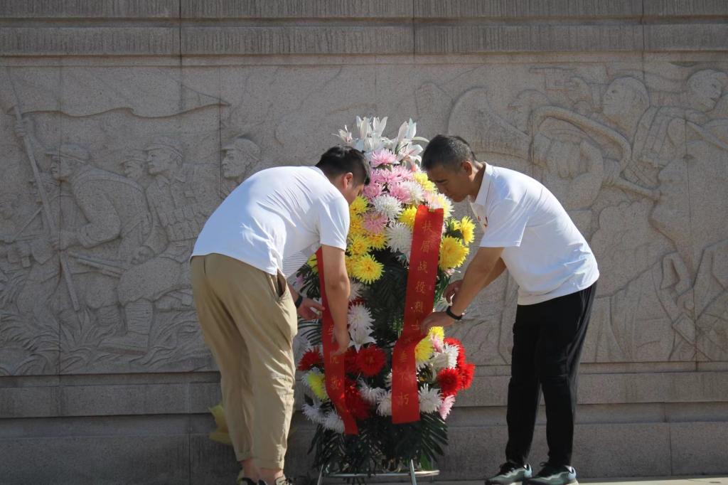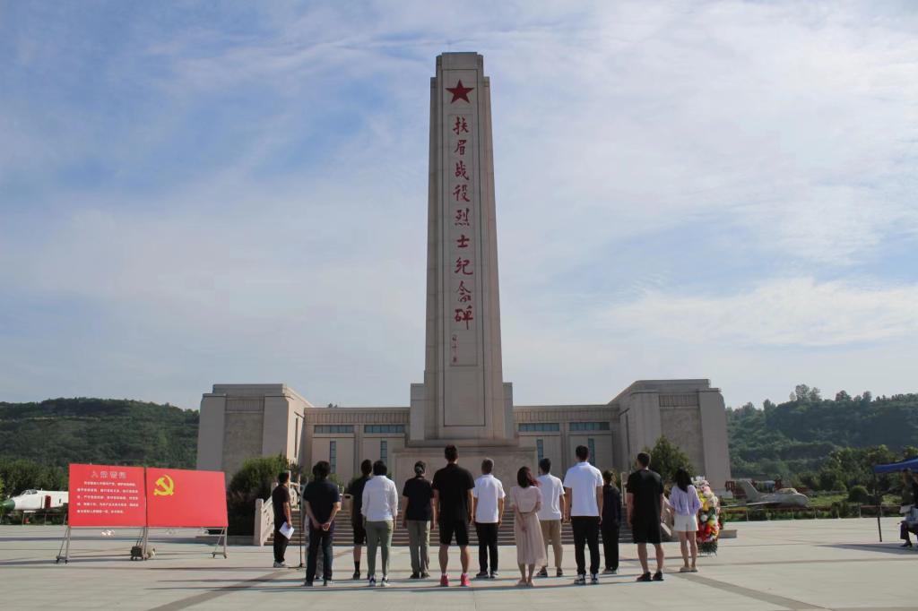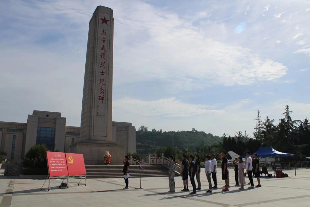 我院教职员工一行来到了位于宝鸡眉县的扶眉战役纪念馆,纪念馆里树木葱郁,烈士纪念碑高耸而庄严,全体教职员工向革命先烈默哀致敬、敬献花篮,在党政办刘志云主任的带领下面对党旗,庄严地举起右手,重温入党誓词,以铿锵有力的宣誓表达了为共产主义事业奋斗终身的坚定决心。