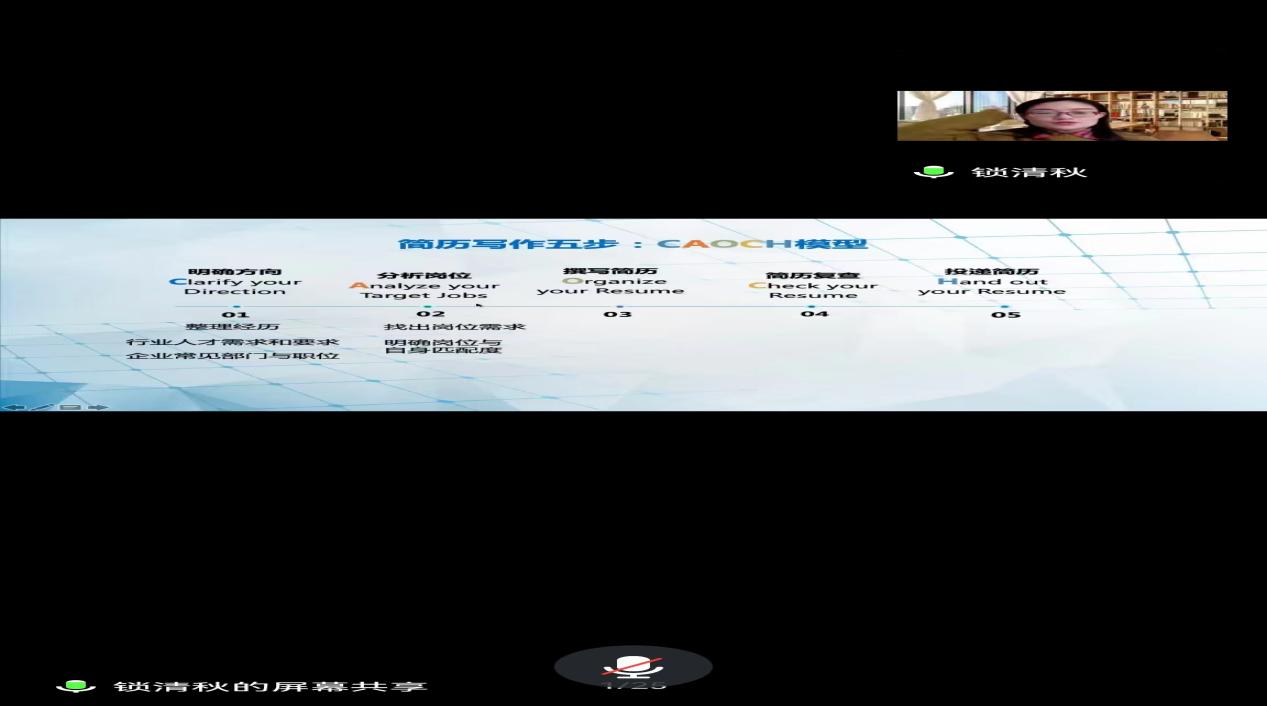 在同学们了解制作简历的注意事项后,罗晓婷博士给大家讲解了简历写作模型的具体步骤和内容,指导大家根据自身情况做出一份适合自己的简历。