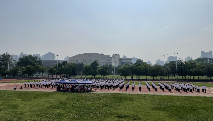 庄严的国歌声拉开了本次队列汇操的序幕。会议伊始,主持人介绍与会领导、裁判、办公室人员及各班指导教师,党委书记王鑫宣布汇操表演正式开始。