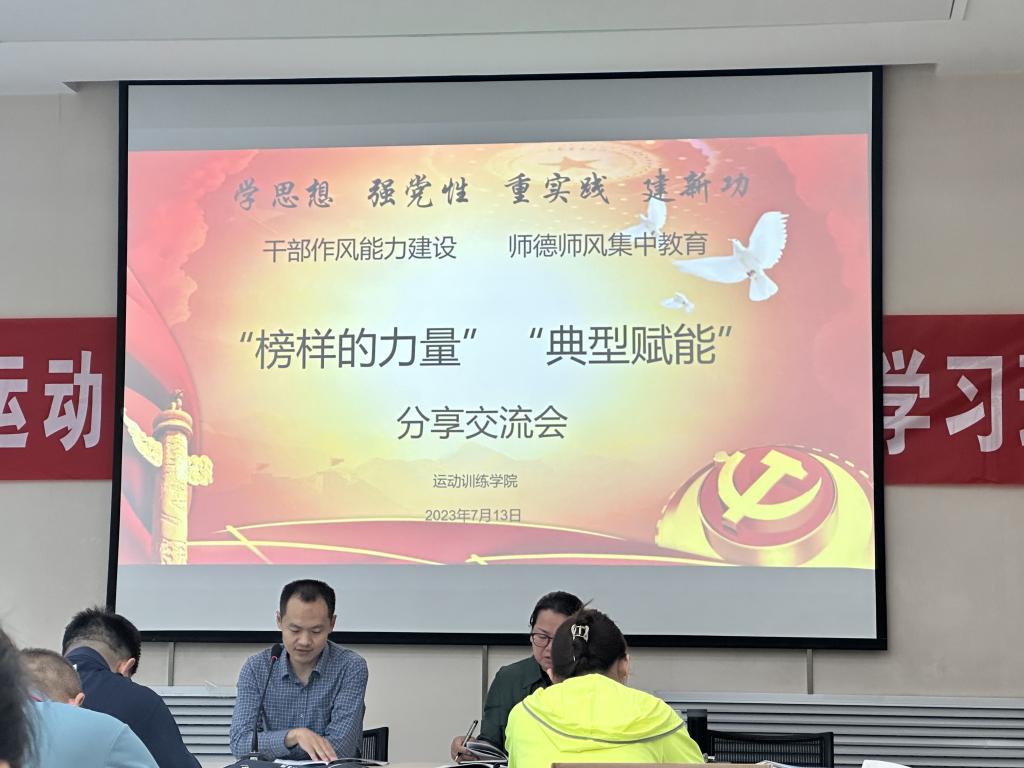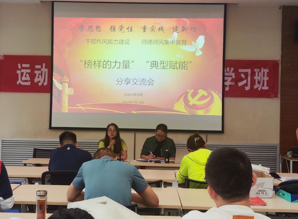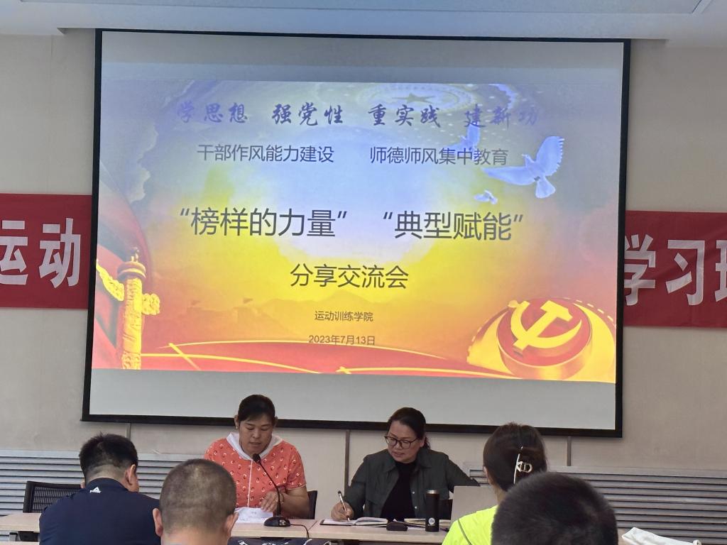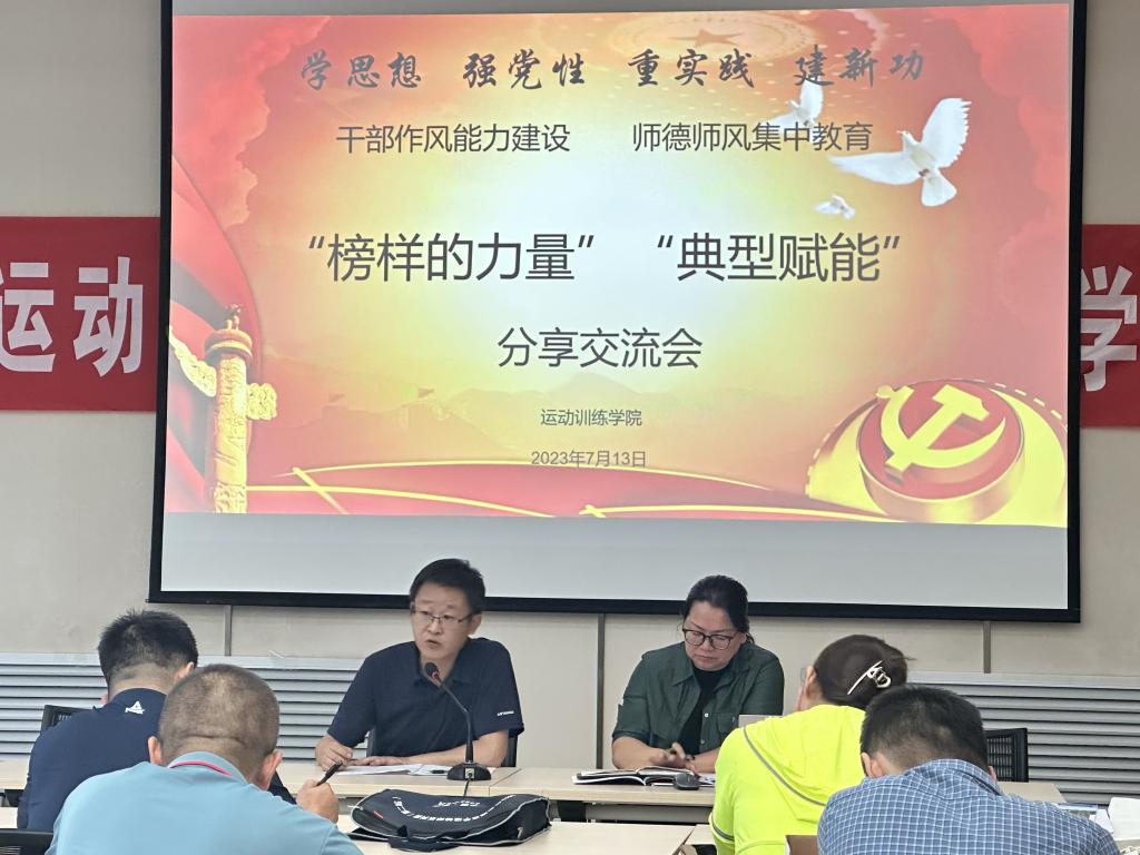 高山仰止,方知才疏,三人同行,觉左右为师。为深入学习贯彻习近平新时代中国特色社会主义思想,贯彻落实习近平总书记关于教育的重要论述、立德树人的根本任务,充分发挥教师的示范引领作用,更好加强师德师风建设,促进教师的专业养成,同时也为青年教师提供学习交流的机会。7月13日下午运动训练学院开展“榜样的力量”、“典型赋能”交流分享会。运动训练学院领导班子、全体教师出席了本次活动。会议由党委书记王鑫主持。