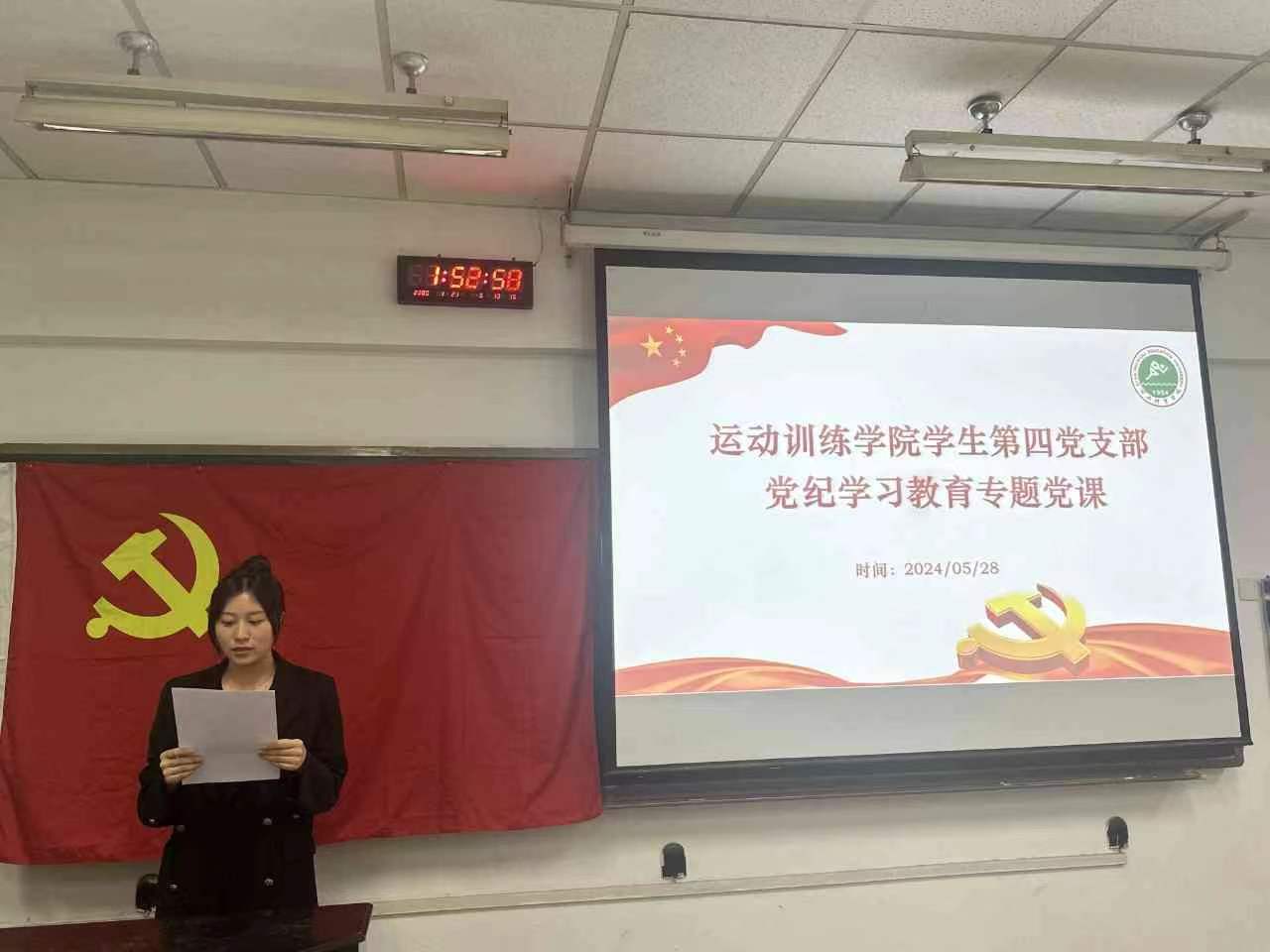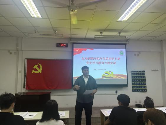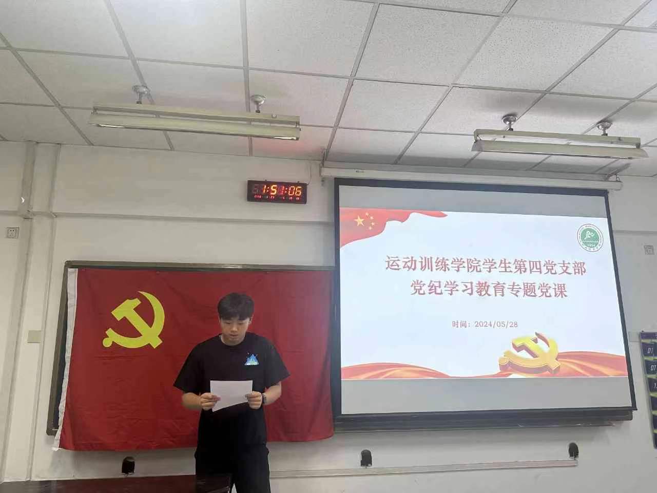 为进一步提升学生党员的党性修养,加强学生党员对党纪国法的认识和遵守意识。5月28日,运动训练学院学生第四党支部成功举办了以“党纪学习教育”为主题的专题党课。此次党课由2021级年级负责人王涛授课,2021级全体学生党员和部分入党积极分子参加了学习。