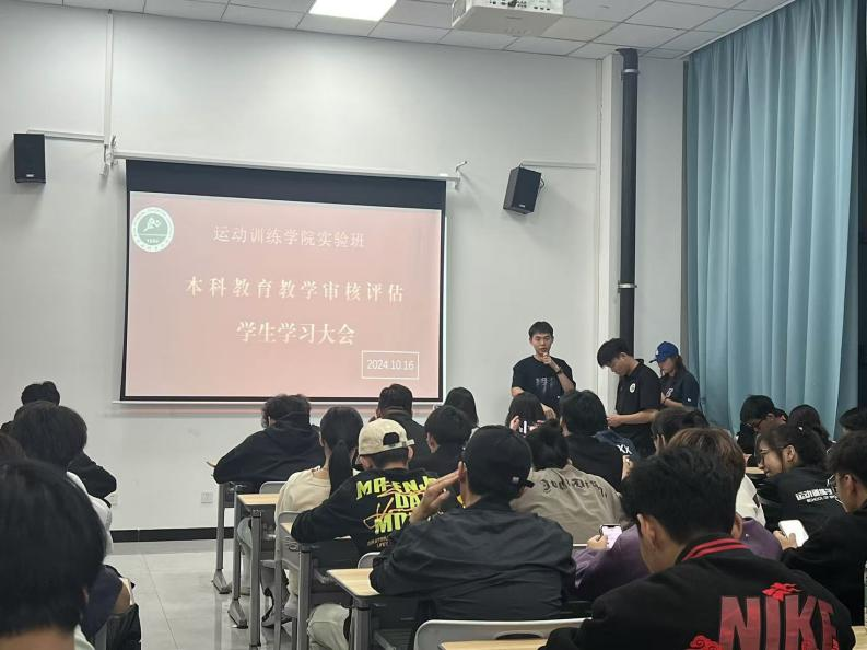 为全面提升本科教育教学水平,紧抓本科生培养质量。根据运动训练学院相关要求,10月16日,运动训练实验班开展本科教育教学审核评估学生学习大会。此次的学习大会旨在全面推进实验班学生积极构建自觉、自省、自律、自查、自纠的大学质量文化,做到以评促建、以评促改、以评促管、以评促强,全面提高本科学生教学质量。晚20点,会议在辅导员沈家瑞的主持下,于橄榄球馆106教室召开,实验班全体同学参加此次大会。
