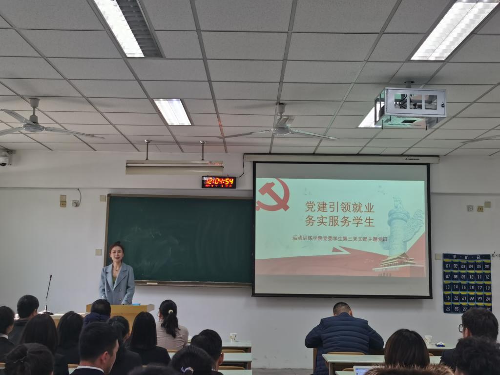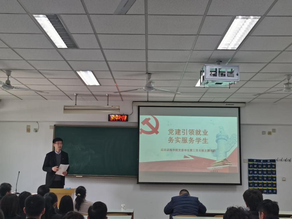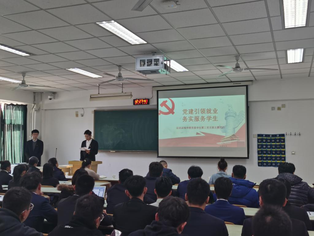 为全面落实“三会一课”制度,加强党员教育管理,推进学习教育常态化制度化,为学生工作提供坚强组织保障。12月1日,运动训练学院党委学生第三党支部在教学楼举办“党建引领就业 务实服务学生”主题党日活动。运动训练学院党委书记王鑫、院长武洛生、党委组织员宋文杰、副院长郑峰、就业指导中心闵怡博老师应邀出席,学生第三党支部全体党员参加本次活动,活动由学生第三党支部书记于昕主持。