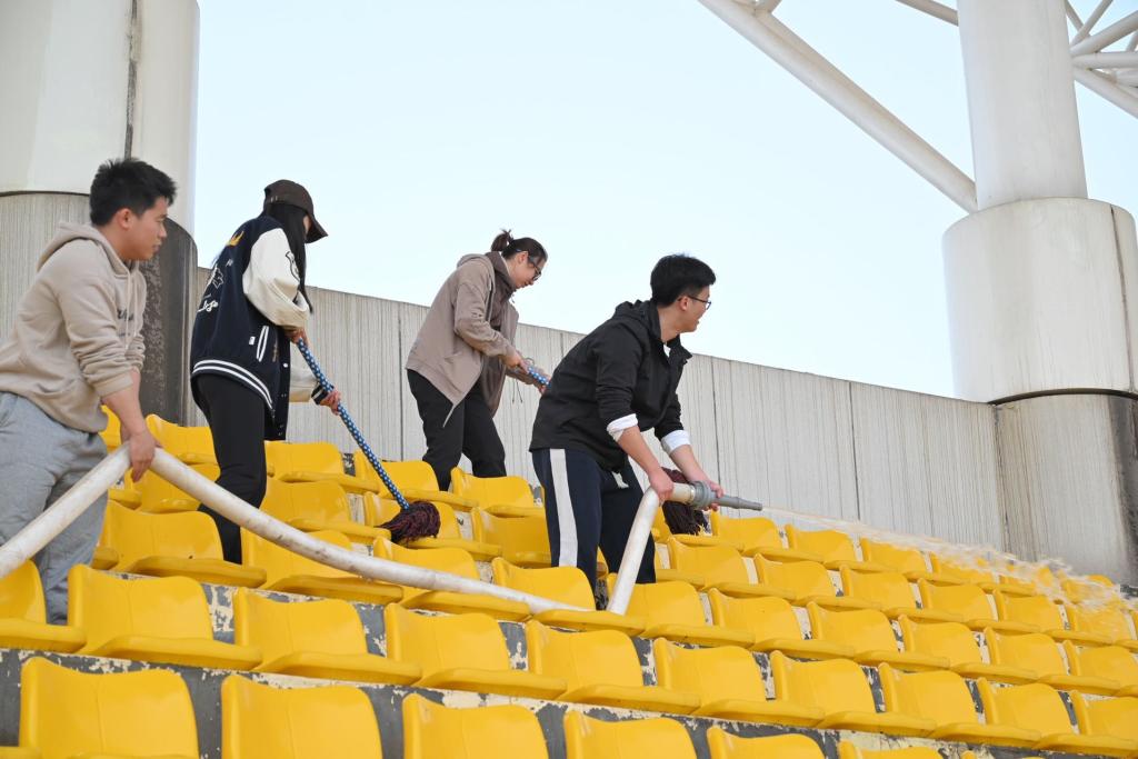 三月春风处处留,雷锋精神心中留。为践行社会主义核心价值观,深入开展学雷锋活动。3月24日,运动训练学院2022级年级办积极响应校团委和学院党委的号召组织党员、学生干部、三好学生、助学金获得者等200余人在鄠邑校区继续开展‘弘扬雷锋精神,争做时代新人’主题活动。美化校园环境是每一名学生应尽的义务和责任,同学们利用课余时间纷纷携带清洁工具,积极有序的前往校区橄榄球场地看台擦拭座椅、清扫垃圾,同学们不放过任何一个角落,尽管尘土飞扬,又脏又累,但大家毫无怨言。本次活动持续一个小时左右,美丽洁净的看台又恢复了往日的‘美颜’。