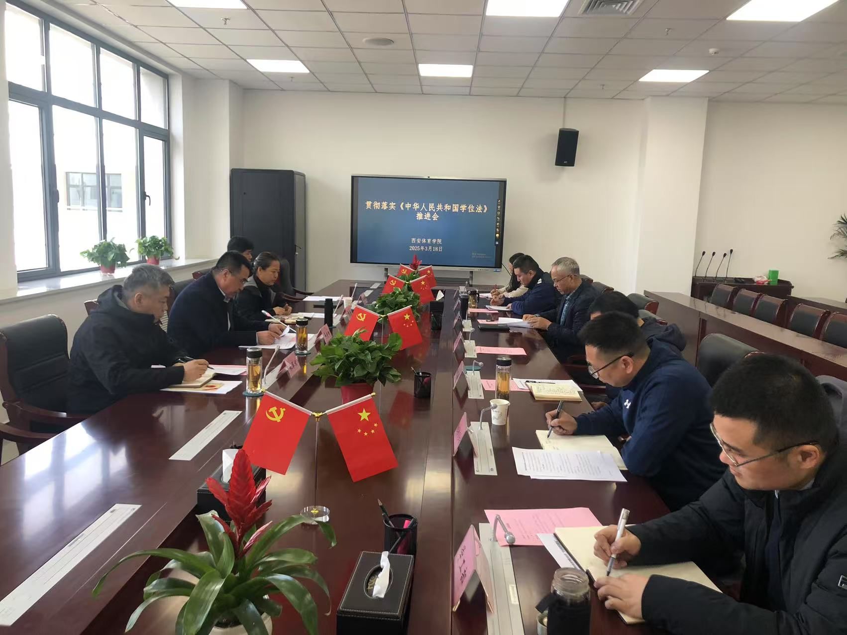 2025 年 3 月 18 日,西安体育学院在鄠邑校区教学综合楼 440 召开了贯彻落实《中华人民共和国学位法》工作推进会。校领导李富生、谢英、张葆欣、毕德鹏等出席了此次会议,各相关部门负责人齐聚一堂,共同探讨和推动学校学位工作的发展。