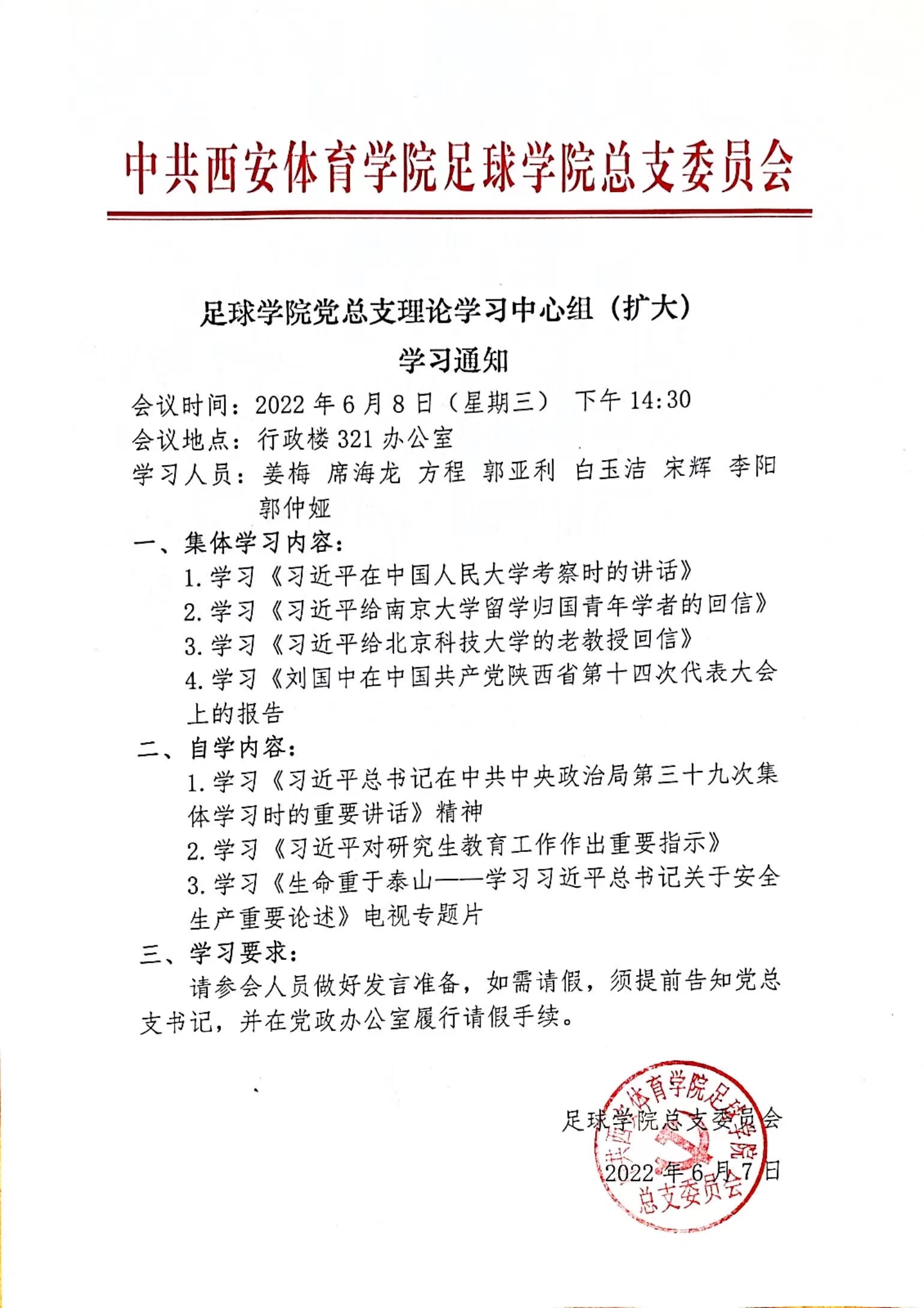 足球学院党总支理论学习中心组(扩大)学习通知