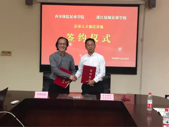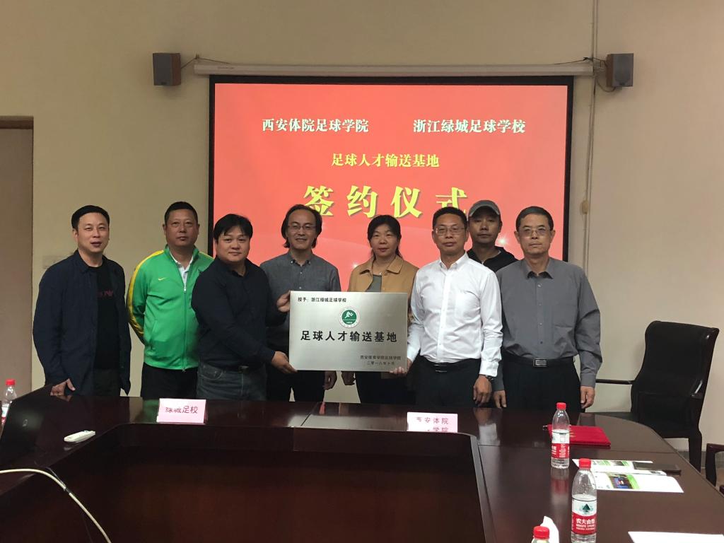 2018年10月30日,西安体育学院足球学院在西安体育学院纪委书记赵军带领下,足球学院院长朱军、足球学院常务顾问杨钢、足球学院教研室副主任马俊一行四人访问了浙江绿城足球学校,并正式建立双方足球发展合作关系。