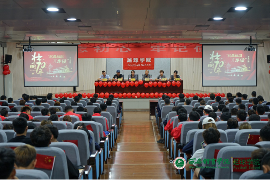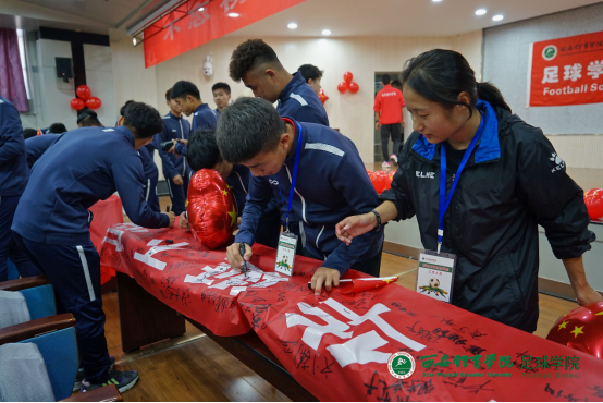 西安体育学院足球学院于2019年9月29日举行盛大的“祝福祖国七十华诞”签名仪式。足球学院党总支书记姜梅,副院长席海龙,教研室副主任马俊,办公室主任岳志铁,交流中心主任张芬,辅导员李阳等出席了本次仪式。办公室主任岳志铁老师负责主持。