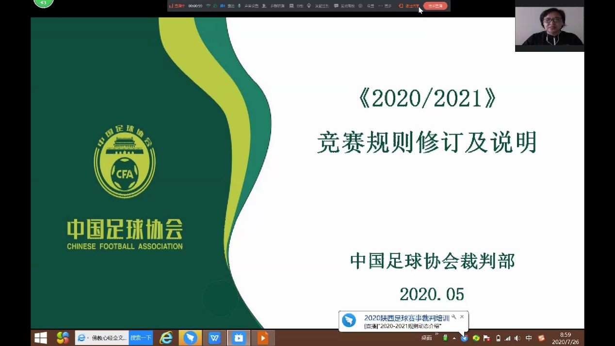 为贯彻落实《中国足球改革发展总体方案》关于加强足球专业人才培养等方针,加强我省足球裁判员队伍的建设,推动我省足球裁判员事业进一步发展,更好的服务于第十四届全运会足球项目,由陕西省学生体育协会发起,由陕西省足球协会、西安体育学院足球学院联合承办的全省足球赛事裁判员线上培训于7月25日至26日顺利开展。