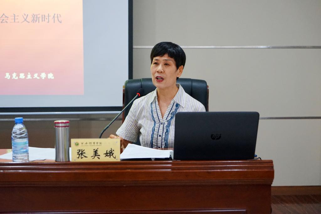 张美娥教授围绕中国共产党百年辉煌的四个发展时期“新民主主义革命时期”“社会主义革命和建设时期”“改革开放和社会主义现代化建设新时期”“中国特色社会主义建设新时代”、铸就中国共产党百年辉煌的四件大事“开天辟地救国大业”“改天换地兴国大业”“翻天覆地富国大业”“惊天动地强国大业”展开讲述。并结合自身36年来的从教经验讲到立德树人,她提出每个教师必须坚定立场、遵守职业道德、努力提升自己,业精于勤、淬炼传道授业解惑的能力。