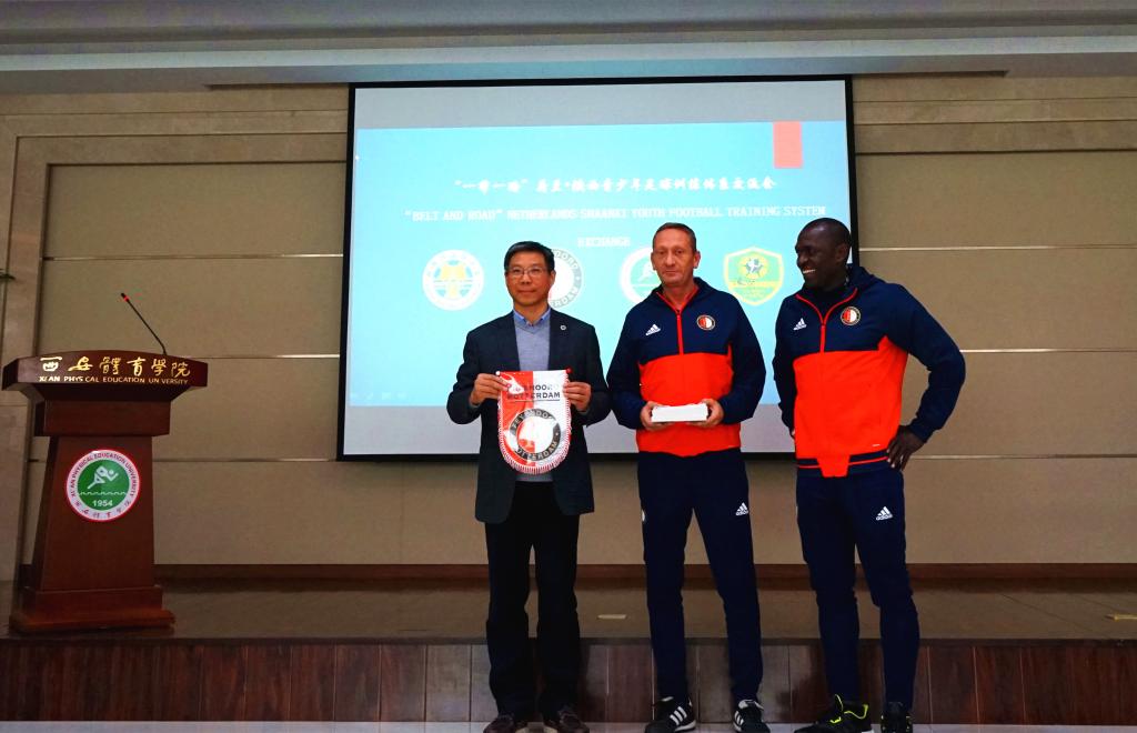 西安体育学院副院长文立新致欢迎词,他说,中国积极倡导并实施的“一带一路”得到了荷兰的积极响应和参与,费耶诺德足球俱乐部地处的鹿特丹是“一带一路”的终点,西安是“一带一路”的源头和起点,希望我们双方的足球合作能够充分借助“一带一路”倡议,开拓思路,探索新模式,积极开创双方足球发展的美好未来。也希望足球学院学生利用这种高层次足球专业实践活动,认真学习世界足球青训的先进理念和方法,尽快提升专业水平。